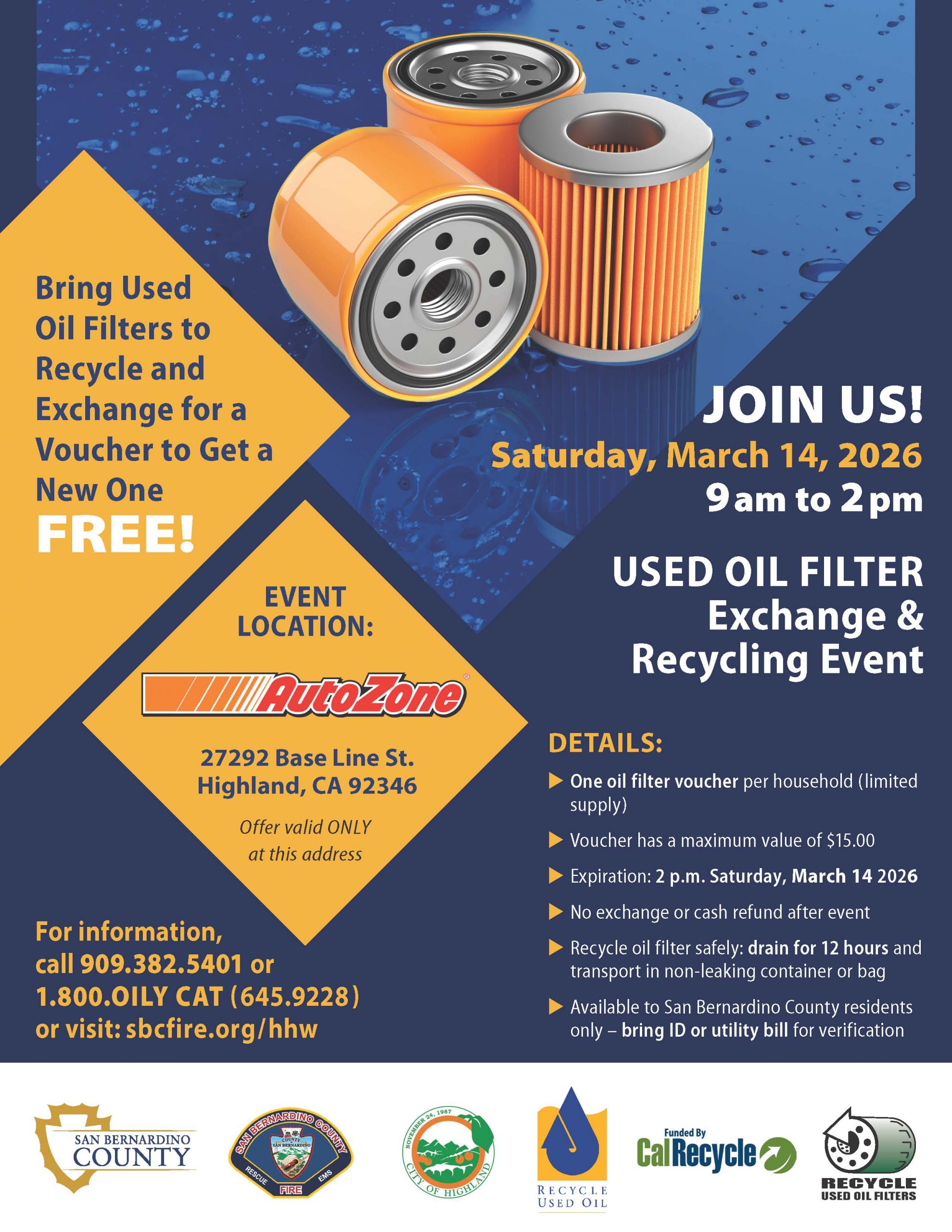 For information, call 909-382-5401 or 1-800-OILY-CAT (645-9228) or visit: sbcfire.org/hhw