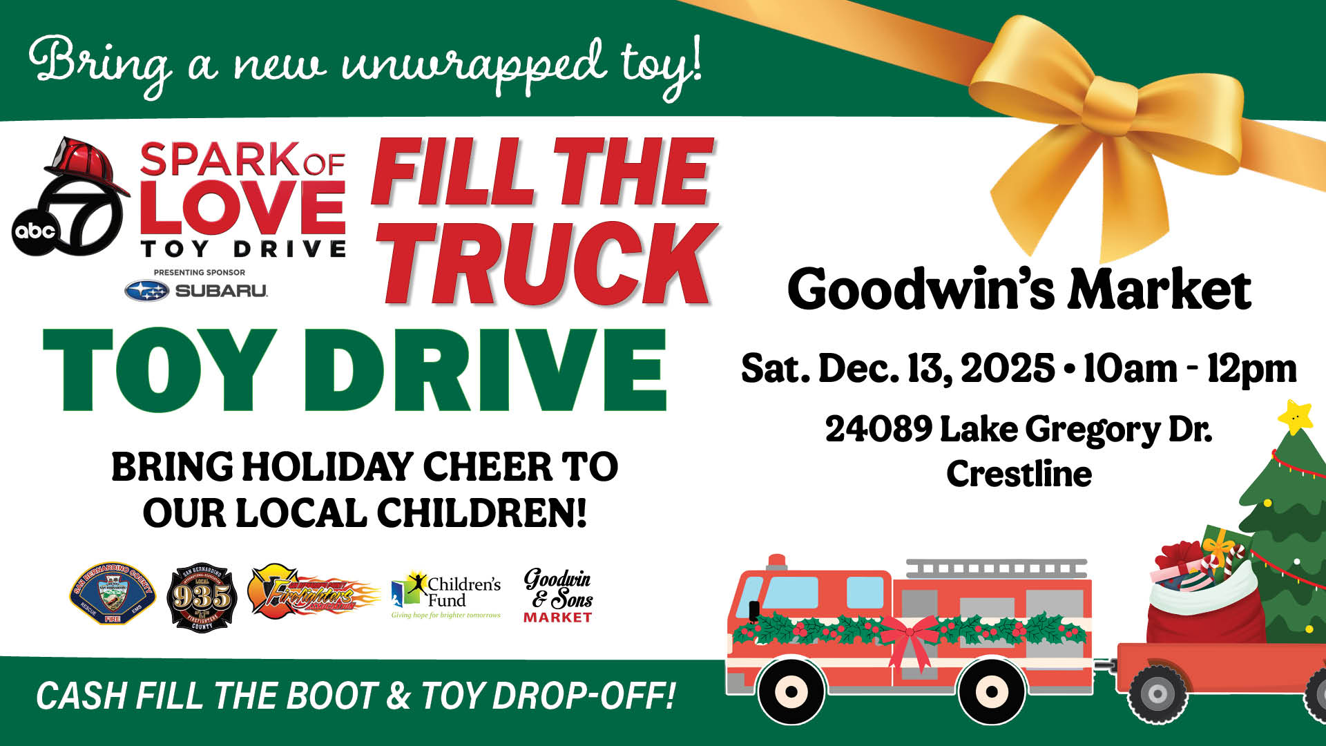 Spark of Love Fill the Truck Toy Drive flyer with event details for December 6 at Costco San Bernardino.
